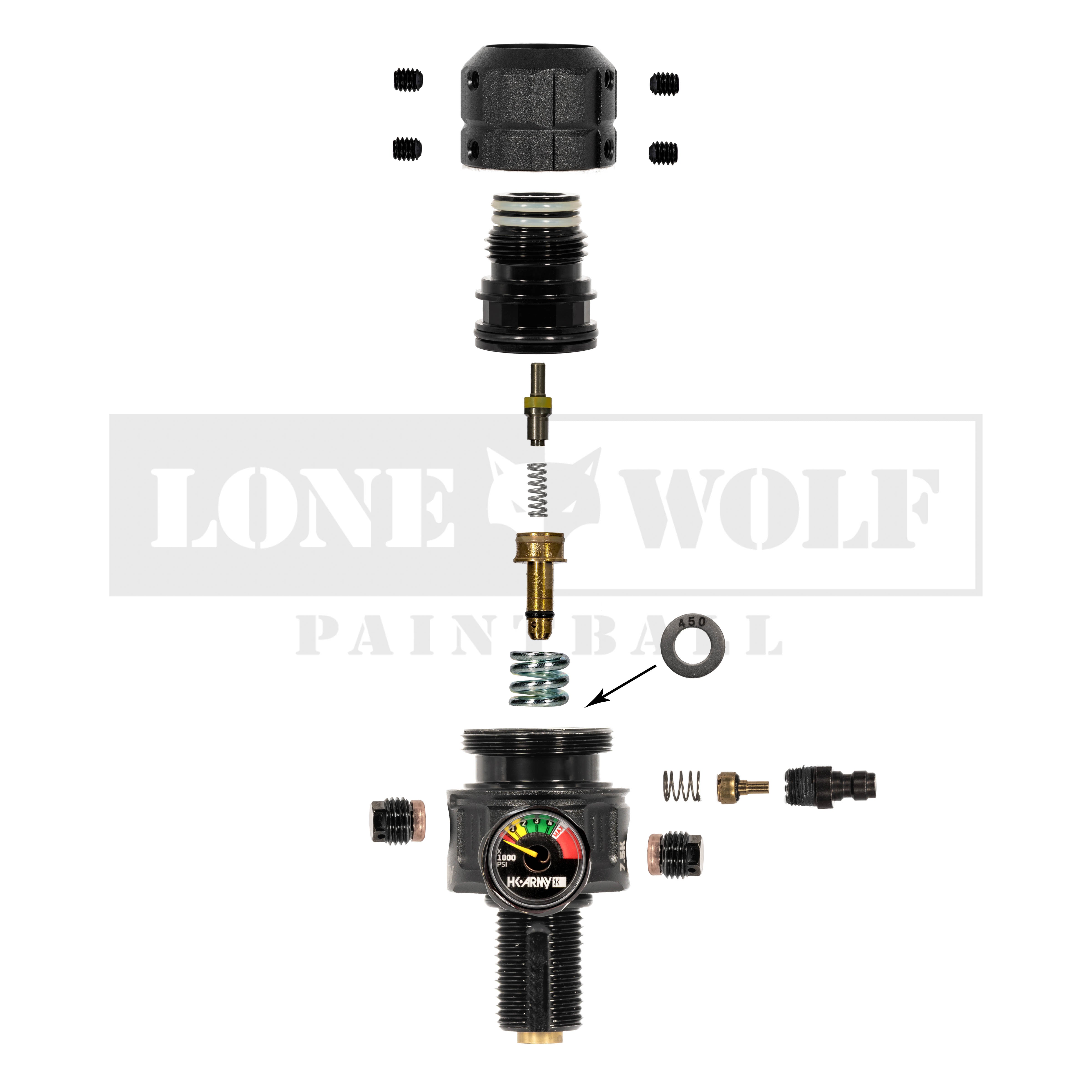 Comes with spare o-rings, 3 pressure shims, piston o-ring, pin valve o-ring, socket wrench, allen wrench, and set screws. Everything needed to keep your regulator running at peak performance.