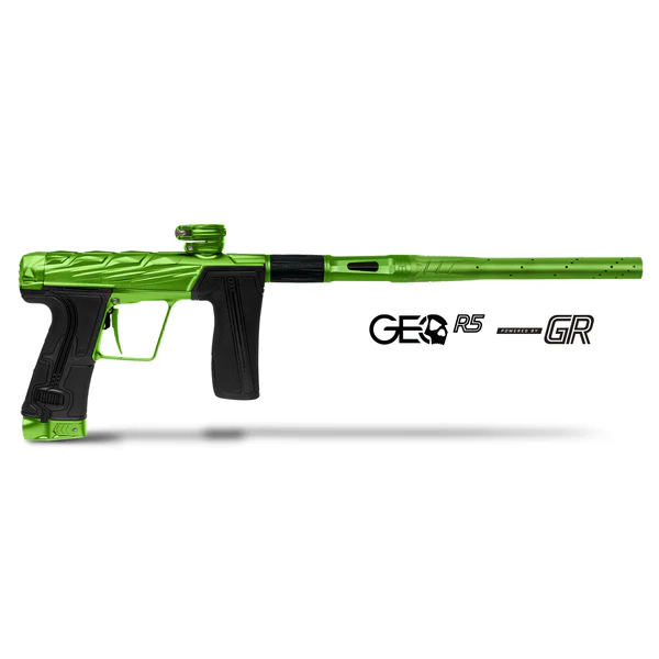 Les poignées arrière enveloppantes abritent le nouvel ensemble solénoïde et le dernier package électronique MME, comprenant une interface utilisateur graphique OLED, un module USB et Bluetooth. Ceux-ci permettent des réglages de paramètres via l'application ou le contrôle d'autres appareils Bluetooth. Le corps et le cadre se séparent facilement sans fils, câbles ou tuyaux entre eux, conservant la séparation rapide et facile des marqueurs Eclipse actuels. Le Geo R5 a été repensé pour offrir une plate-forme plus fraîche et plus efficace pour les joueurs et les techniciens.